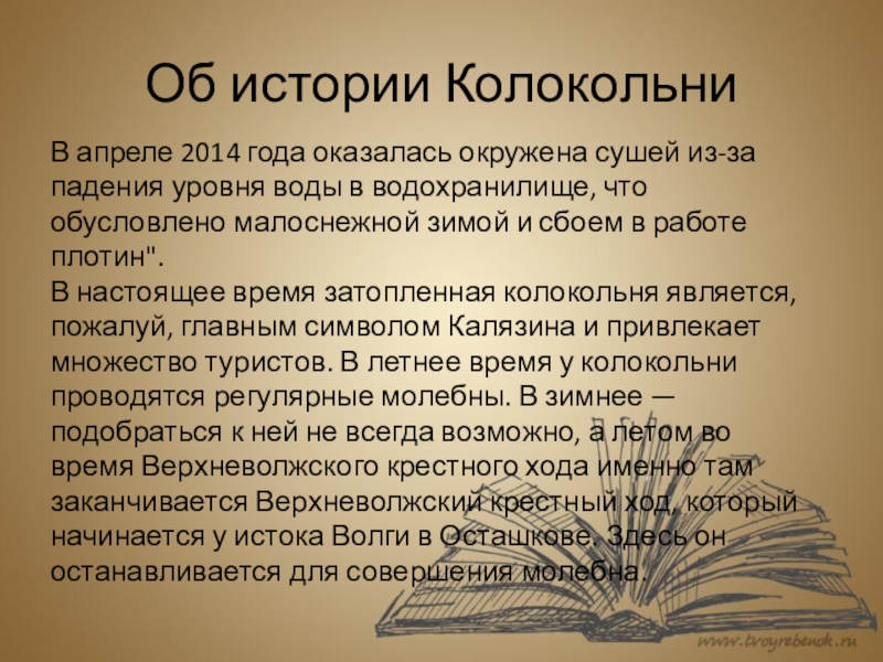 Об истории КолокольниВ апреле 2014 года оказалась окружена сушей из-за падения уровня воды в водохранилище, что обусловлено