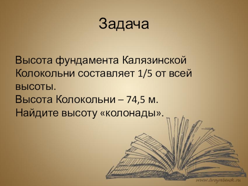 ЗадачаВысота фундамента Калязинской Колокольни составляет 1/5 от всей высоты.Высота Колокольни – 74,5 м.Найдите высоту «колонады».