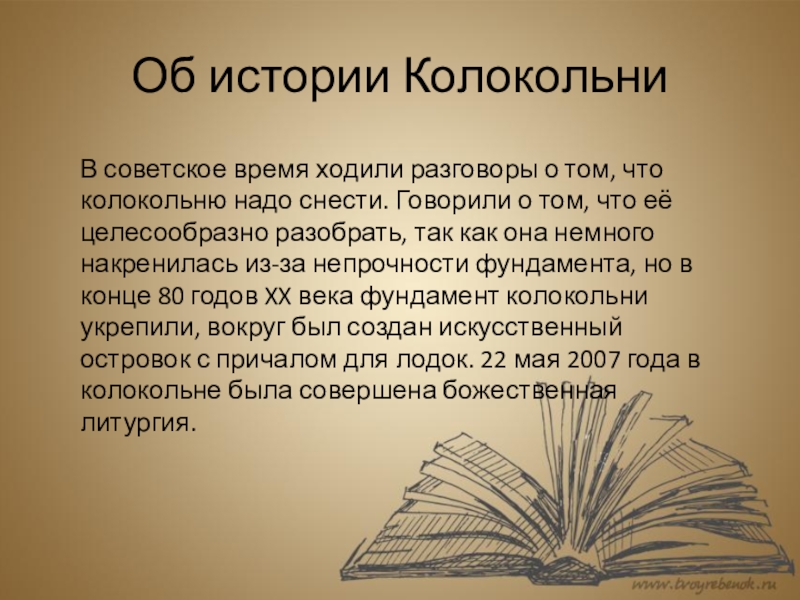 Об истории КолокольниВ советское время ходили разговоры о том, что колокольню надо снести. Говорили о том, что