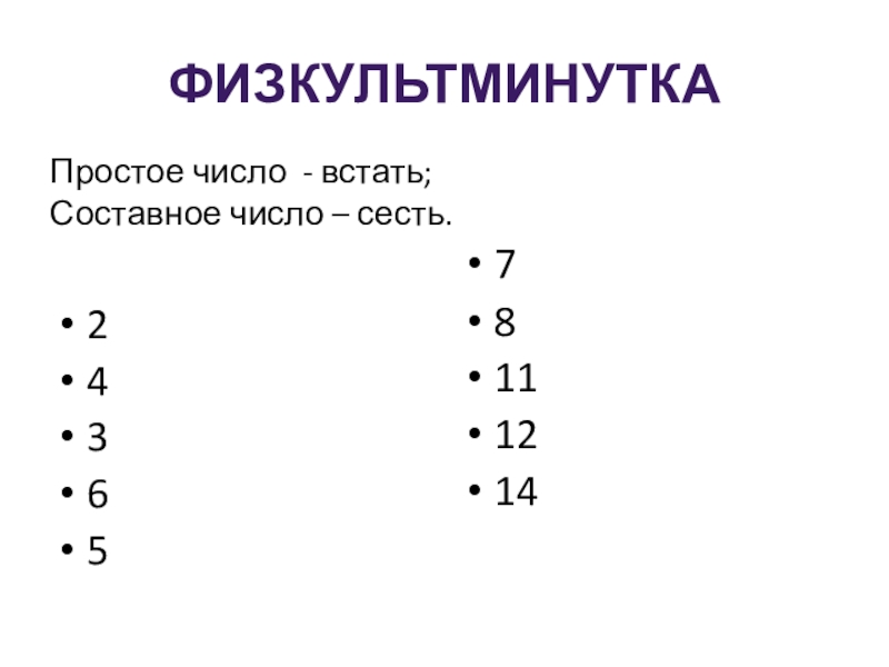 Физкультминутка2436578111214Простое число - встать;Составное число – сесть.