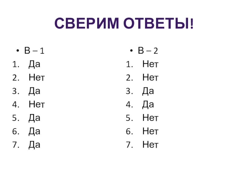 Сверим ответы!В – 1ДаНетДаНетДаДаДаВ – 2НетНетДаДаНетНетНет