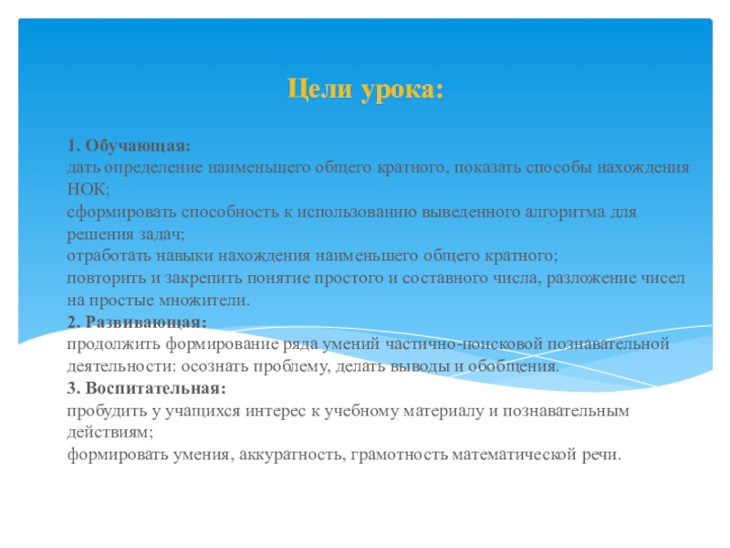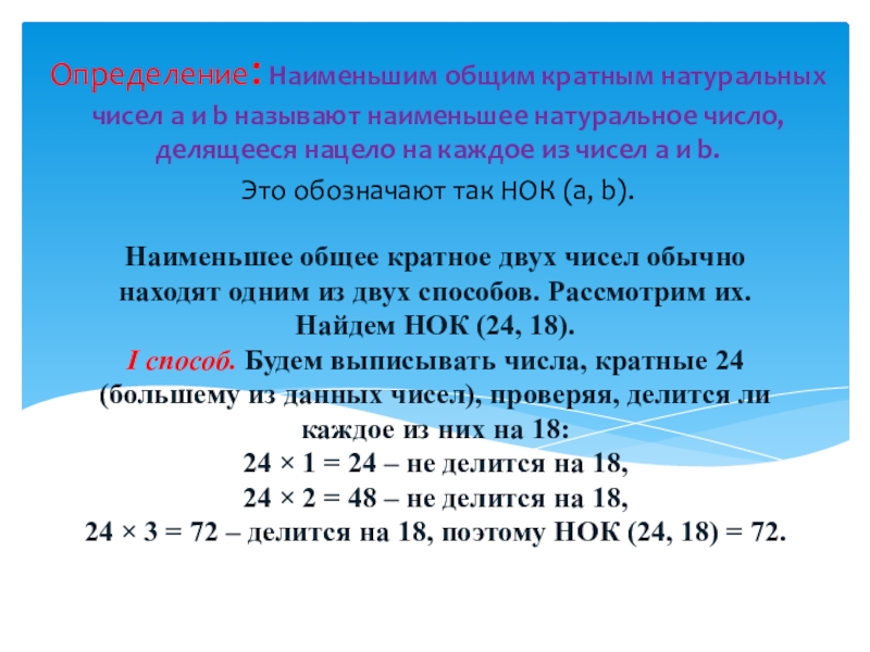 Определение: Наименьшим общим кратным натуральных чисел a и b называют наименьшее натуральное число, делящееся нацело на каждое из чисел a и b.