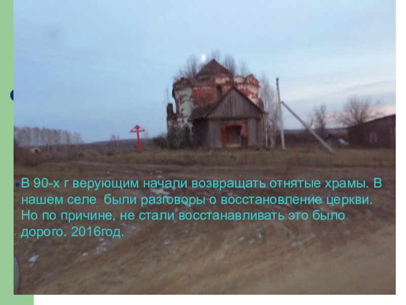 В 90-х г верующим начали возвращать отнятые храмы. В нашем селе были разговоры о восстановление церкви. Но по причине, не стали восстанавливать это было дорого. 2016год.