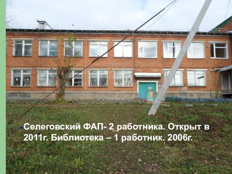 Селеговский ФАП- 2 работника. Открыт в 2011г. Библиотека – 1 работник. 2006г.