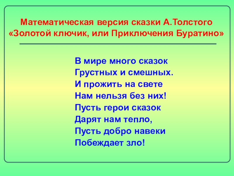 Математическая версия сказки А.Толстого «Золотой ключик, или Приключения Буратино»В мире много сказокГрустных и смешных.И прожить на светеНам
