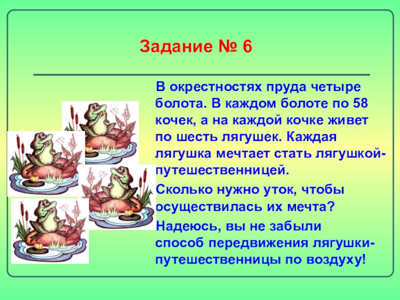 Задание № 6В окрестностях пруда четыре болота. В каждом болоте по 58 кочек, а на каждой кочке
