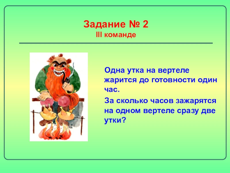 Задание № 2  III командеОдна утка на вертеле жарится до готовности один час. За сколько часов
