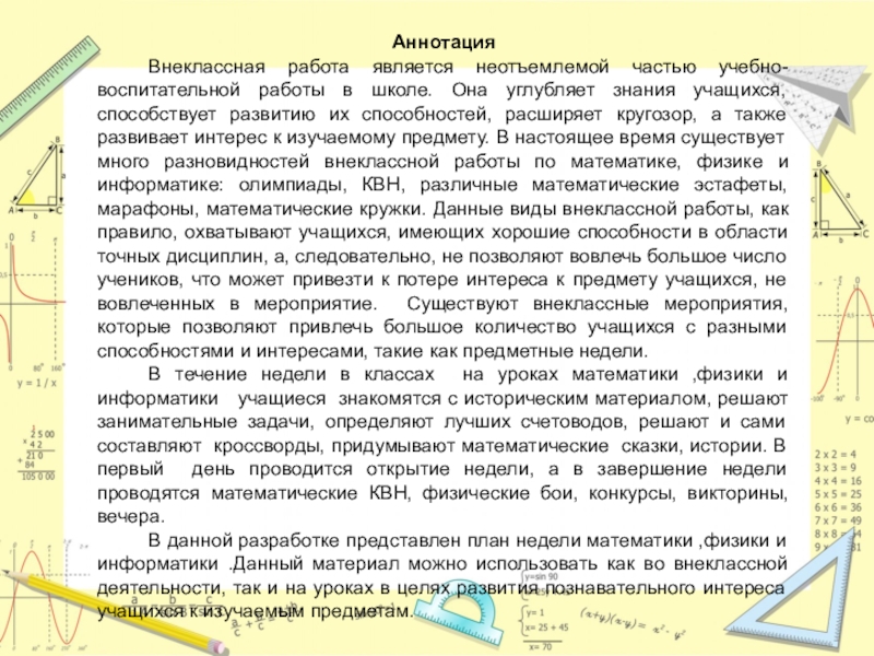 знания учащихся, способствует развитию их способностей, расширяет кругозор, а также развивает интерес к изучаемому предмету. В настоящее время существует много разновидностей внеклассной работы по математике, физике и информатике: олимпиады, КВН, различные математические эстафеты, марафоны, математические кружки. Данные виды внеклассной работы, как правило, охватывают учащихся, имеющих хорошие способности в области точных дисциплин, а, следовательно, не позволяют вовлечь большое число учеников, что может привезти к потере интереса к предмету учащихся, не вовлеченных в мероприятие. Существуют внеклассные мероприятия, которые позволяют привлечь большое количество учащихся с разными способностями и интересами, такие как предметные недели.