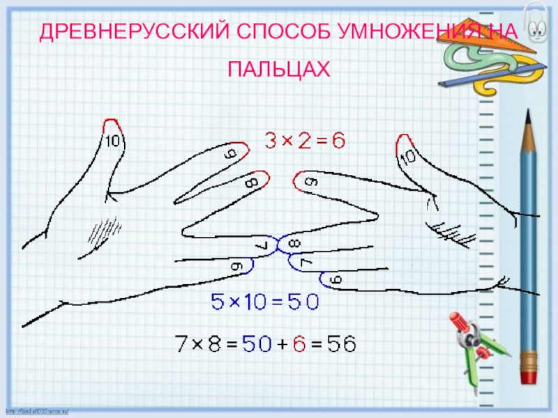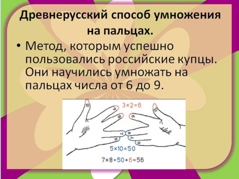 Слайд 16ДРЕВНЕРУССКИЙ СПОСОБ УМНОЖЕНИЯ НА ПАЛЬЦАХ