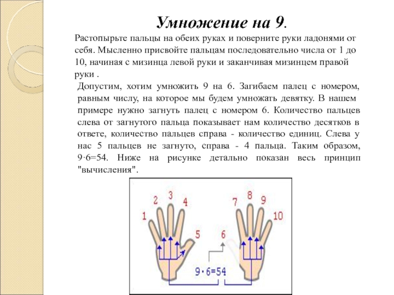 Допустим, хотим умножить 9 на 6. Загибаем палец с номером, равным числу, на которое мы будем умножать девятку. В нашем примере нужно загнуть палец с номером 6. Количество пальцев слева от загнутого пальца показывает нам количество десятков в ответе, количество пальцев справа - количество единиц. Слева у нас 5 пальцев не загнуто, справа - 4 пальца. Таким образом, 9·6=54. Ниже на рисунке детально показан весь принцип "вычисления".