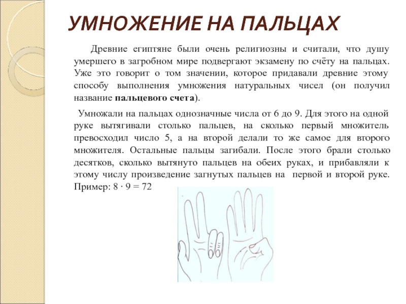 считали, что душу умершего в загробном мире подвергают экзамену по счёту на пальцах. Уже это говорит о том значении, которое придавали древние этому способу выполнения умножения натуральных чисел (он получил название пальцевого счета).