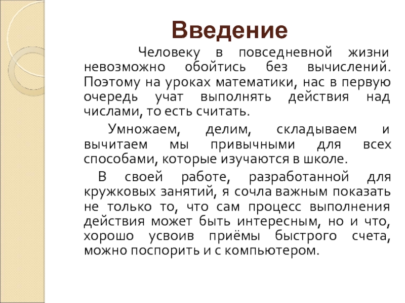 В своей работе, разработанной для кружковых занятий, я сочла важным показать не только то, что сам процесс выполнения действия может быть интересным, но и что, хорошо усвоив приёмы быстрого счета, можно поспорить и с компьютером.
