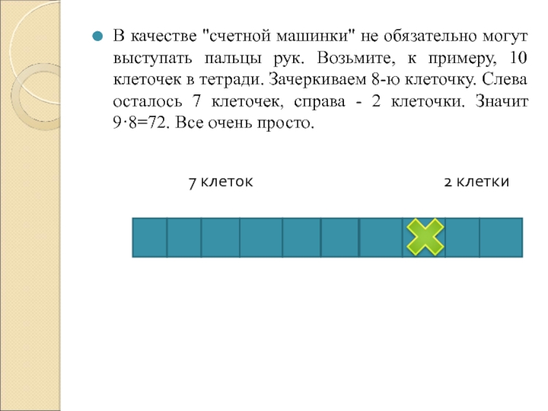 к примеру, 10 клеточек в тетради. Зачеркиваем 8-ю клеточку. Слева осталось 7 клеточек, справа - 2 клеточки. Значит 9·8=72. Все очень просто.