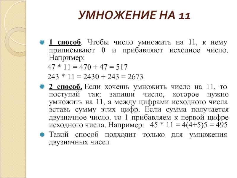 2 способ. Если хочешь умножить число на 11, то поступай так: запиши число, которое нужно умножить на 11, а между цифрами исходного числа вставь сумму этих цифр. Если сумма получается двузначное число, то 1 прибавляем к первой цифре исходного числа. Например: 45 * 11 = 4(4+5)5 = 495