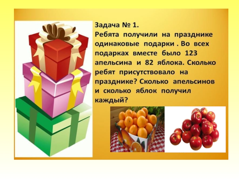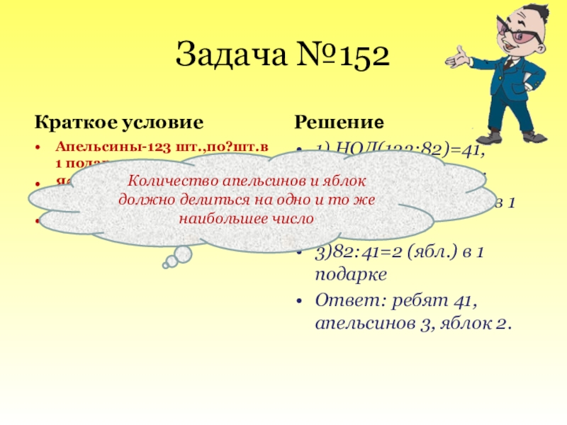 Количество апельсинов и яблок должно делиться на одно и то же наибольшее число