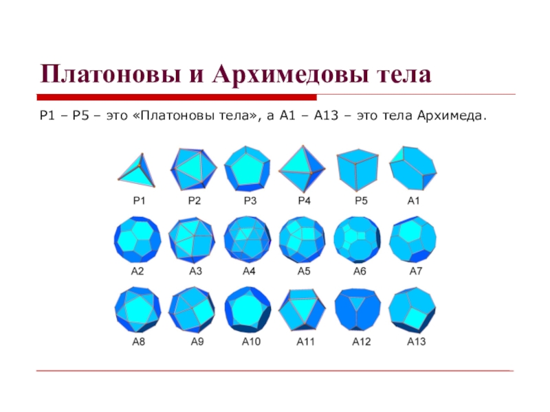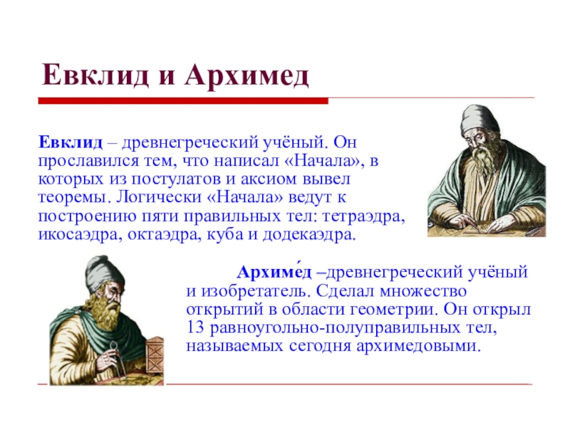 Архиме́д –древнегреческий учёный и изобретатель. Сделал множество открытий в области геометрии. Он открыл 13 равноугольно-полуправильных тел, называемых сегодня архимедовыми.