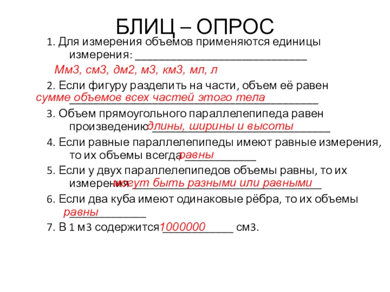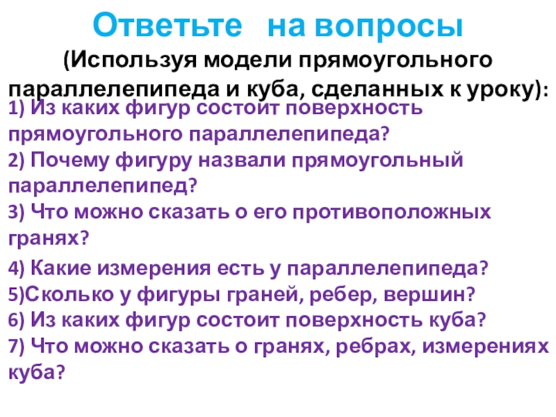 4) Какие измерения есть у параллелепипеда? 5)Сколько у фигуры граней, ребер, вершин?