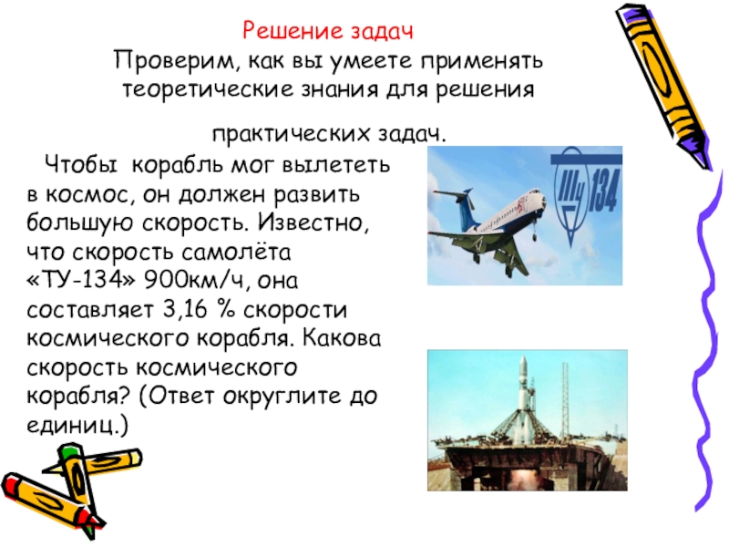 Чтобы корабль мог вылететь в космос, он должен развить большую скорость. Известно, что скорость самолёта «ТУ-134» 900км/ч, она составляет 3,16 % скорости космического корабля. Какова скорость космического корабля? (Ответ округлите до единиц.)