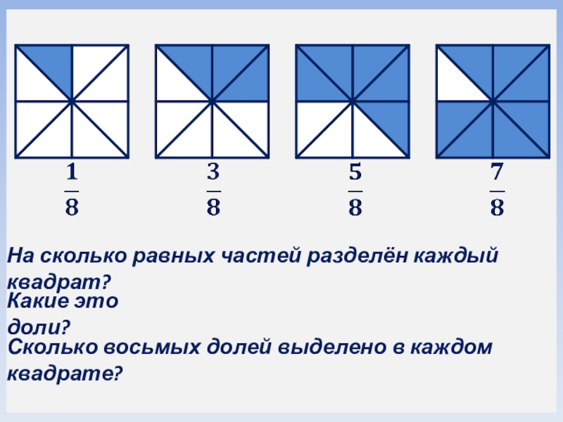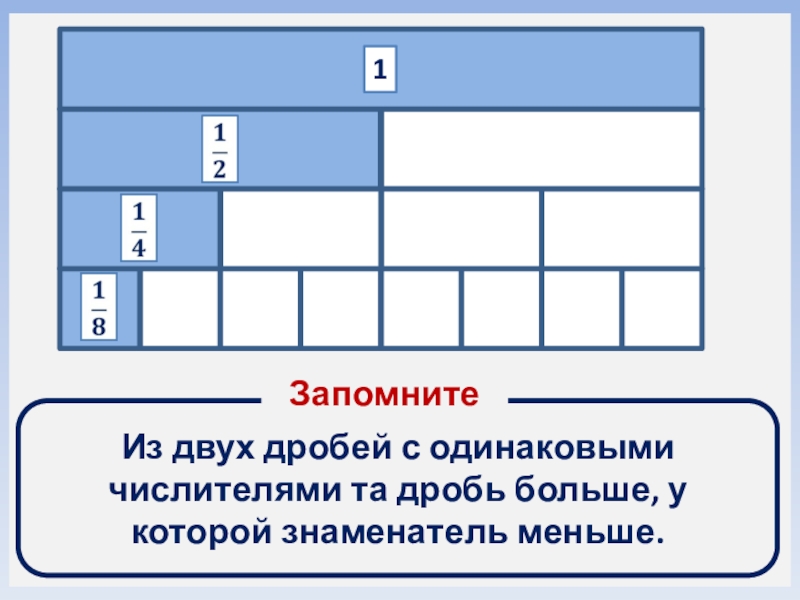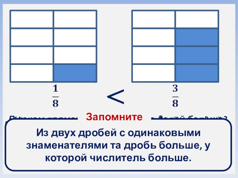 В каком прямоугольнике взято долей больше? В каком прямоугольнике взято долей меньше?