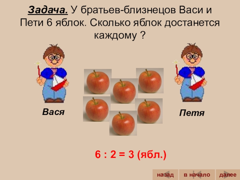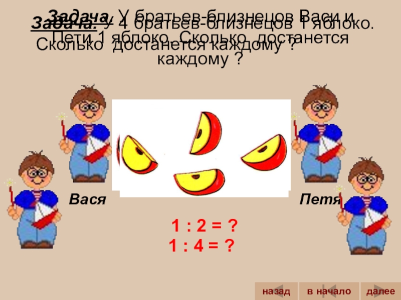 Задача. У 4 братьев-близнецов 1 яблоко.