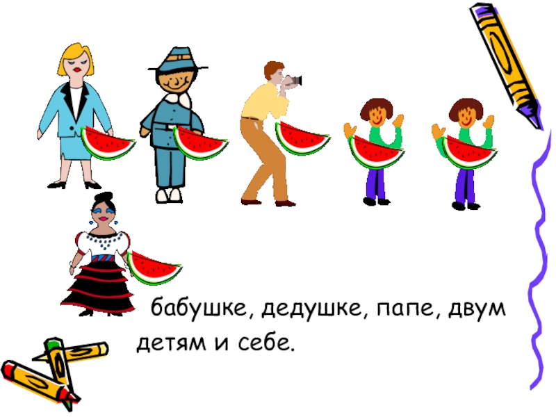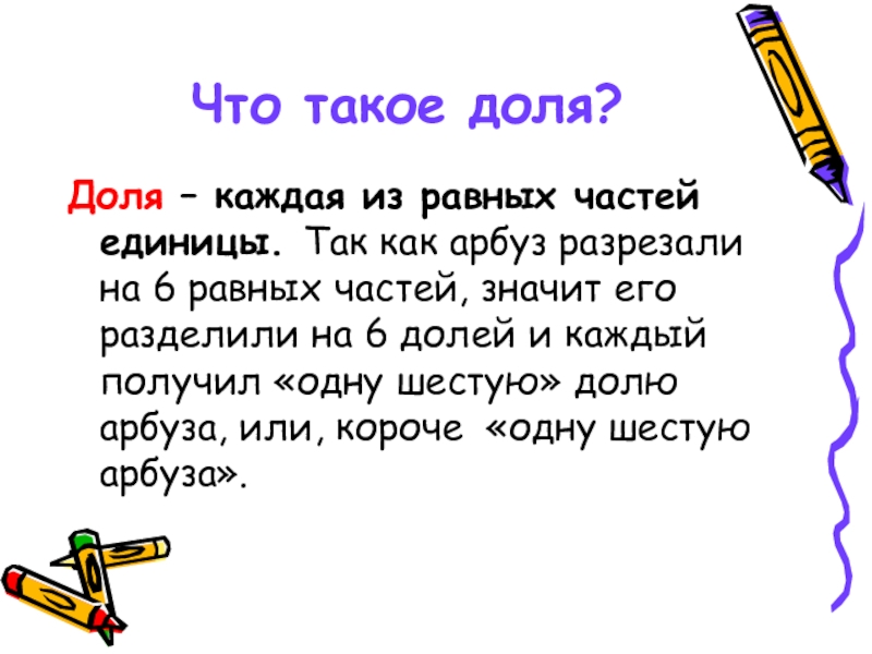 как арбуз разрезали на 6 равных частей, значит его разделили на 6 долей и каждый получил «одну шестую» долю арбуза, или, короче «одну шестую арбуза».