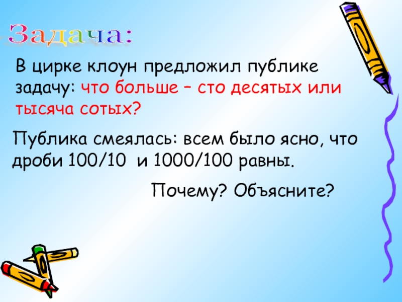Публика смеялась: всем было ясно, что дроби 100/10 и 1000/100 равны.