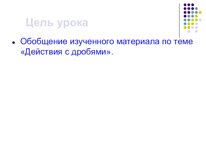 Цель урокаОбобщение изученного материала по теме «Действия с дробями».