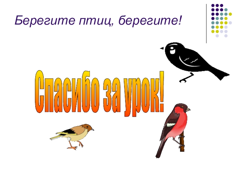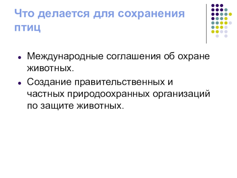 Что делается для сохранения птицМеждународные соглашения об охране животных.Создание правительственных и частных природоохранных организаций по защите животных.