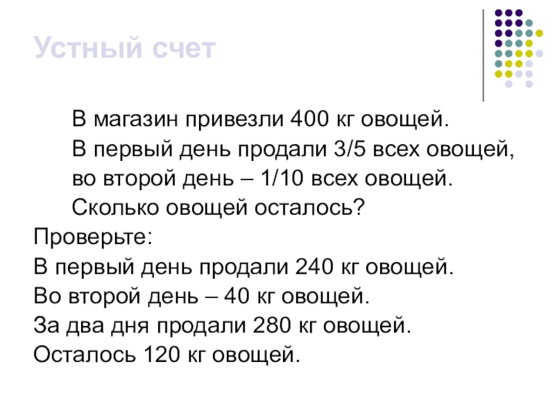Устный счет   В магазин привезли 400 кг овощей.   В первый день продали 3/5