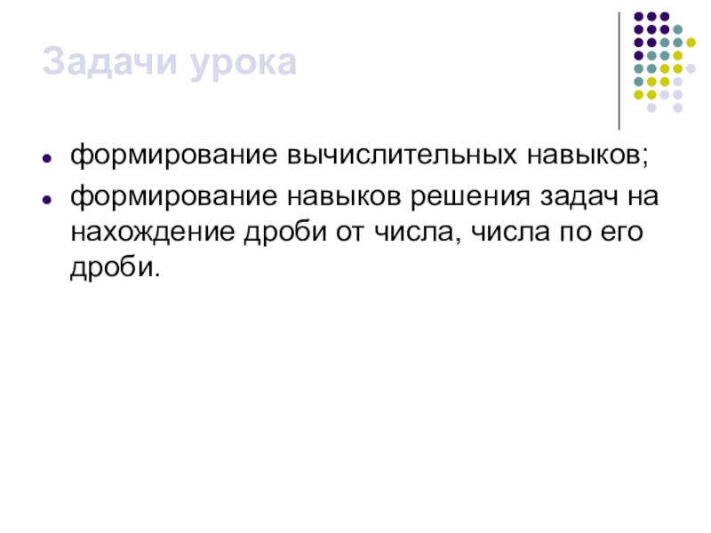 Задачи урокаформирование вычислительных навыков;формирование навыков решения задач на нахождение дроби от числа, числа по его дроби.