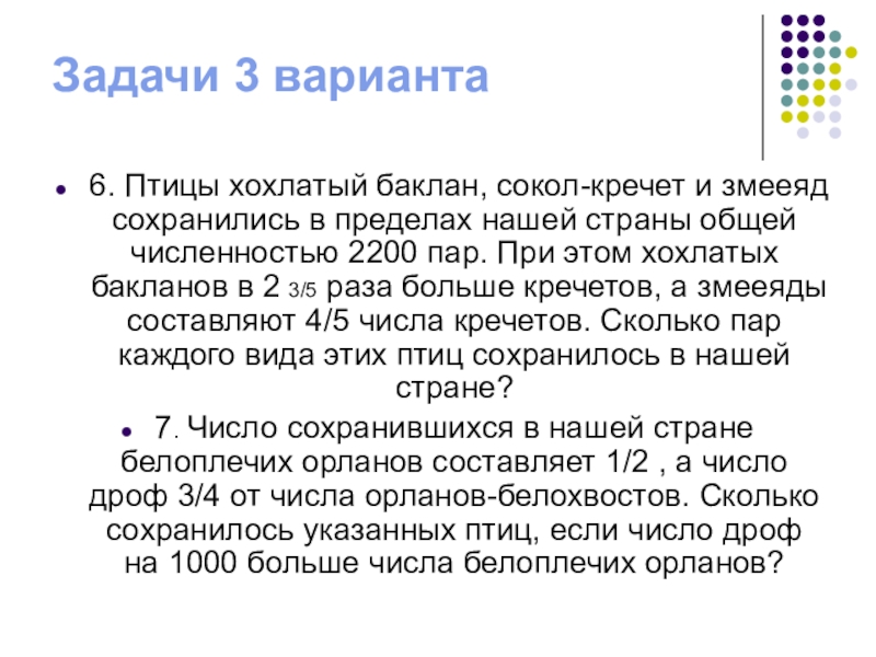 Задачи 3 варианта6. Птицы хохлатый баклан, сокол-кречет и змееяд сохранились в пределах нашей страны общей численностью 2200