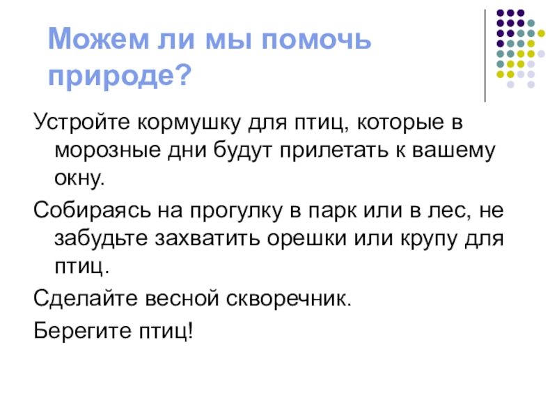 Можем ли мы помочь природе?Устройте кормушку для птиц, которые в морозные дни будут прилетать к вашему окну.