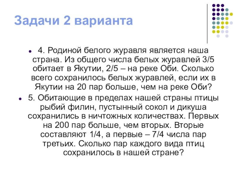 Задачи 2 варианта4. Родиной белого журавля является наша страна. Из общего числа белых журавлей 3/5 обитает в