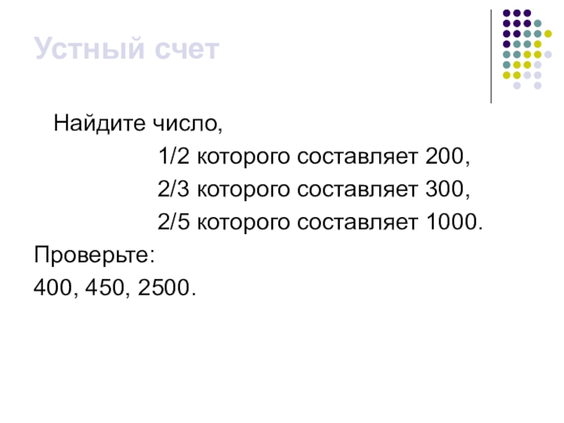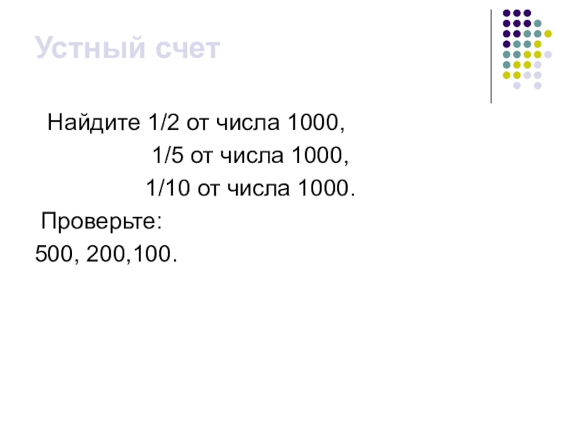 Устный счет Найдите 1/2 от числа 1000,         1/5 от