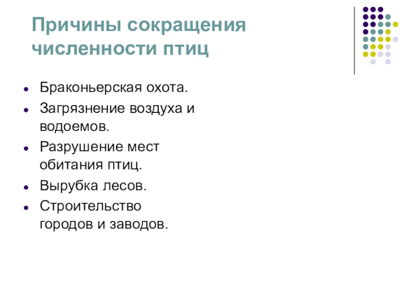 Причины сокращения численности птицБраконьерская охота.Загрязнение воздуха и водоемов.Разрушение мест обитания птиц.Вырубка лесов.Строительство городов и заводов.