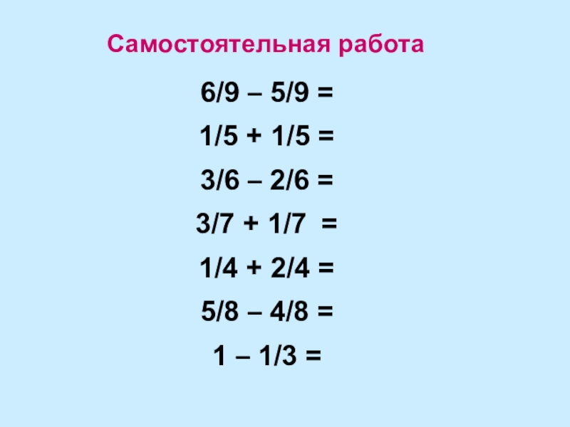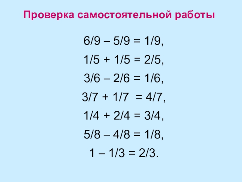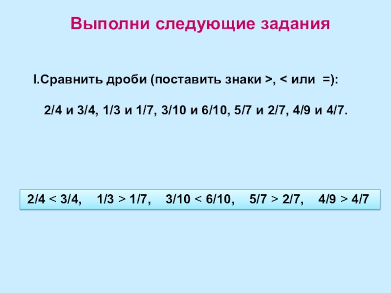 2/4 < 3/4, 1/3 > 1/7, 3/10 < 6/10, 5/7 > 2/7, 4/9 > 4/7