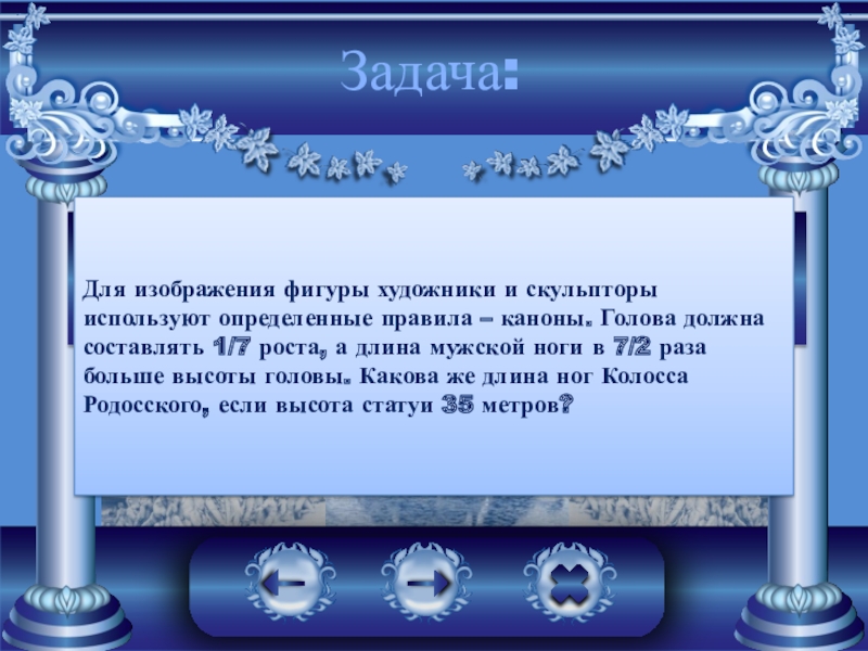 Голова должна составлять 1/7 роста, а длина мужской ноги в 7/2 раза больше высоты головы. Какова же длина ног Колосса Родосского, если высота статуи 35 метров?
