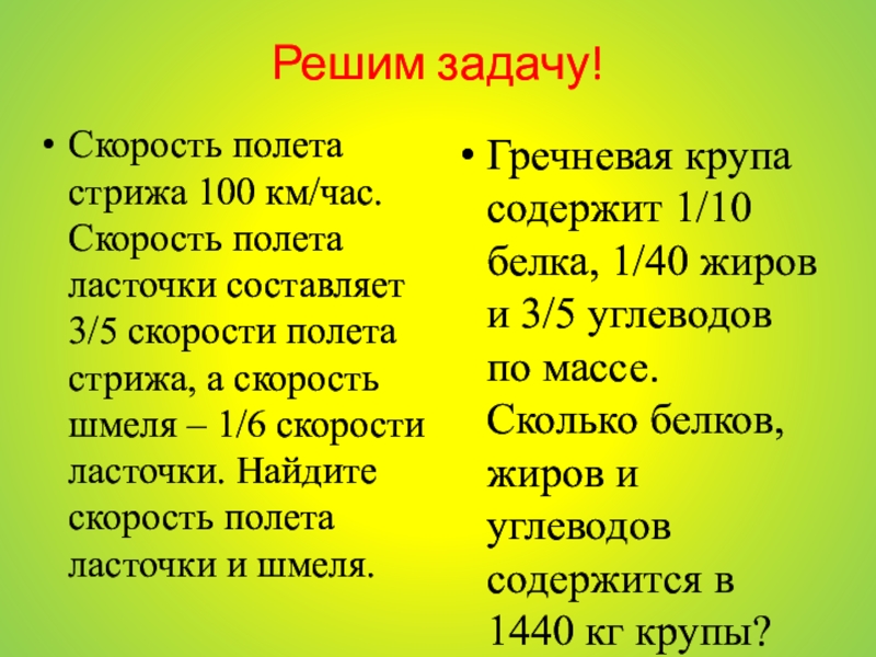 Гречневая крупа содержит 1/10 белка, 1/40 жиров и 3/5 углеводов по массе. Сколько белков, жиров и углеводов содержится в 1440 кг крупы?