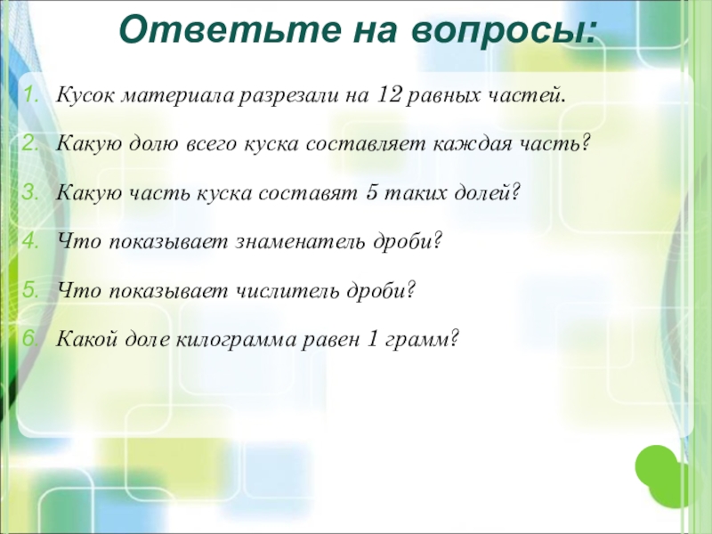 Слайд 29Кусок материала разрезали на 12 равных частей.