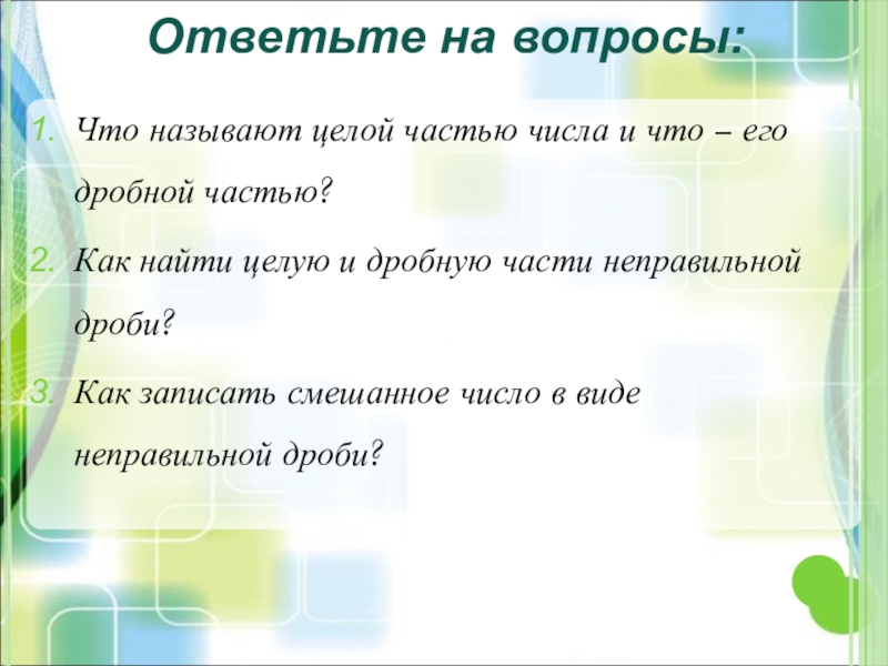 его целую часть на знаменатель дробной части; 2) к полученному произведению прибавить числитель дробной части; 3) записать полученную сумму числителем дроби, а знаменатель дробной части оставить без изменения.