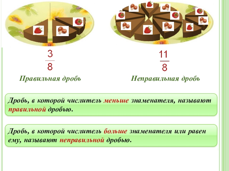Правильная дробьНеправильная дробьДробь, в которой числитель меньше знаменателя, называют правильной дробью. Дробь, в которой числитель больше знаменателя