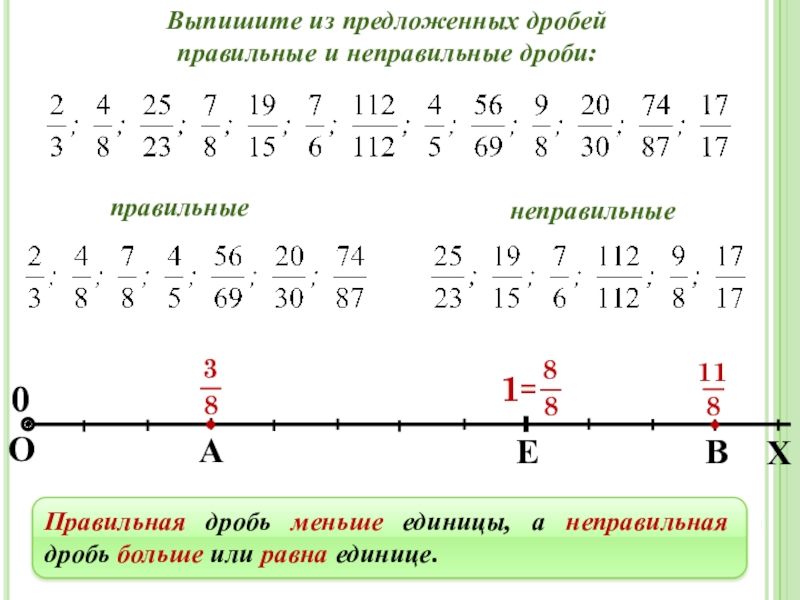 Выпишите из предложенных дробей правильные и неправильные дроби:правильныенеправильныеПравильная дробь меньше единицы, а неправильная дробь больше или равна