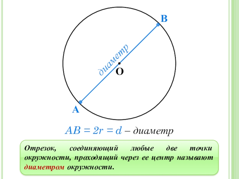 Отрезок, соединяющий любые две точки окружности, проходящий через ее центр называют диаметром окружности.ОдиаметрАВAB = 2r = d