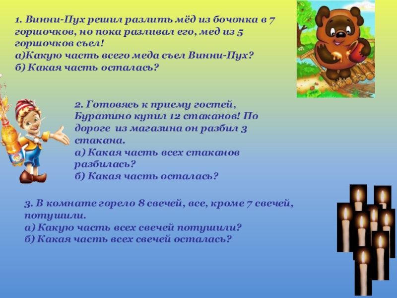 2. Готовясь к приему гостей, Буратино купил 12 стаканов! По дороге из магазина он разбил 3 стакана.