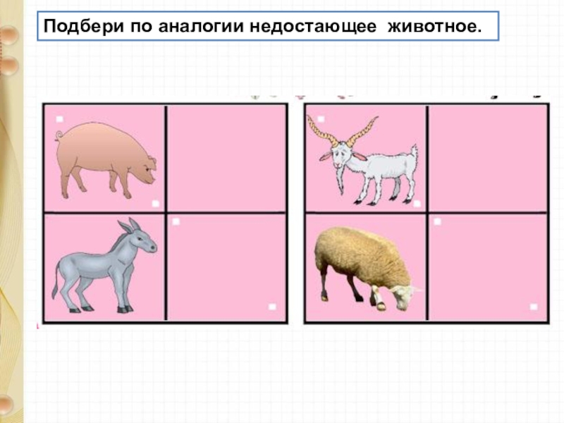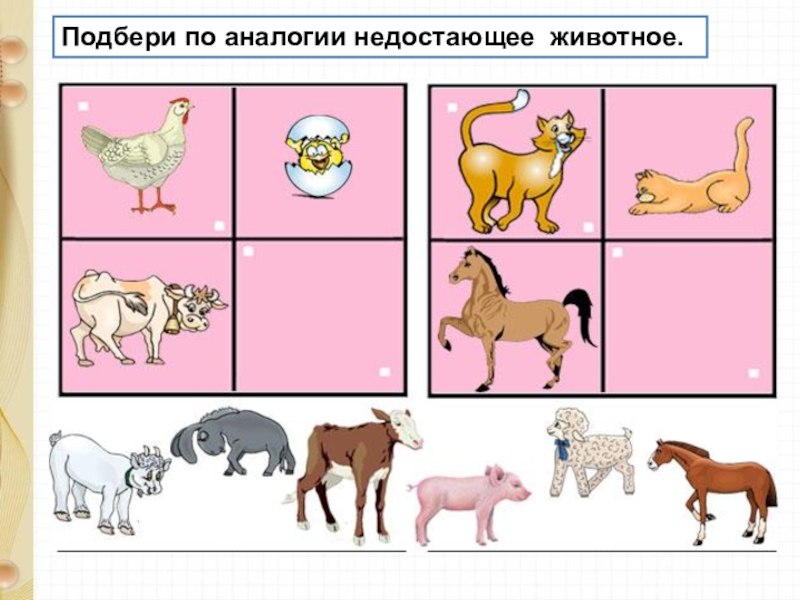 Слайд 5Подбери по аналогии недостающее животное.