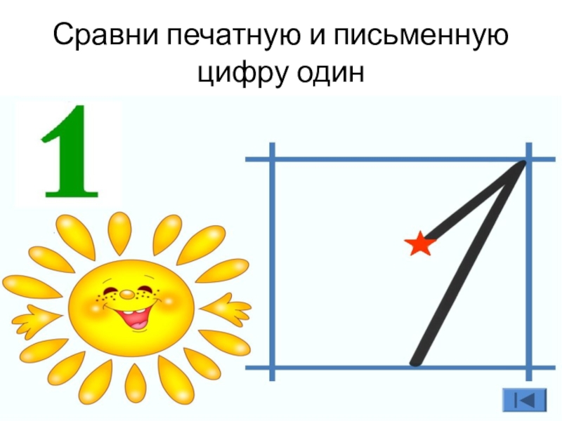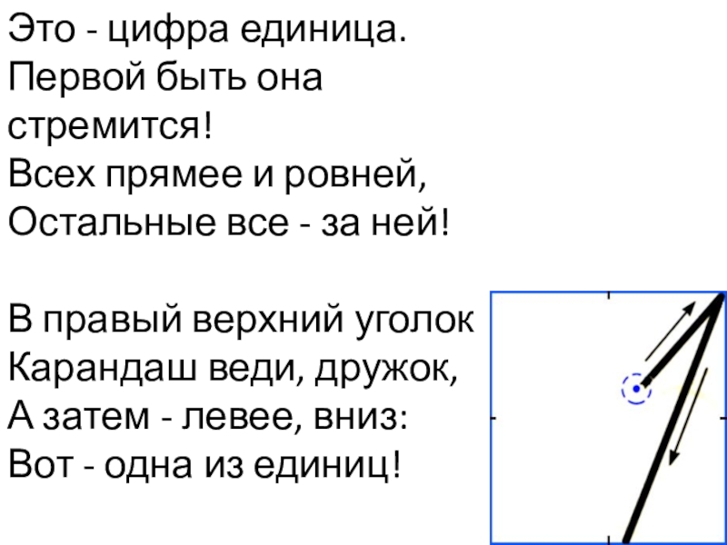 - за ней! В правый верхний уголок Карандаш веди, дружок, А затем - левее, вниз: Вот - одна из единиц!