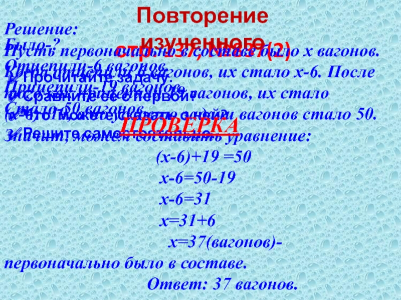 (х-6)+19, а по условию задачи вагонов стало 50. Значит, можем составить уравнение: