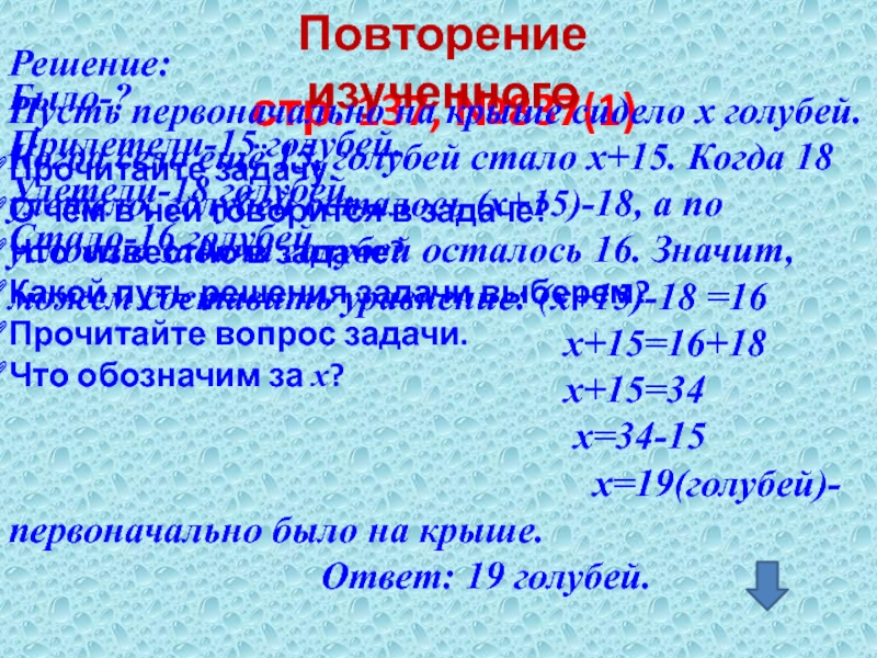 Пусть первоначально на крыше сидело х голубей. Когда село ещё 15, голубей стало х+15. Когда 18 улетело, голубей осталось (х+15)-18, а по условию задачи голубей осталось 16. Значит, можем составить уравнение: (х+15)-18 =16