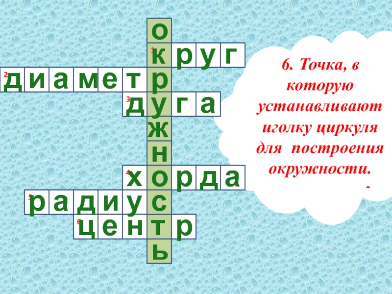 6. Точка, в которую устанавливают иголку циркуля для построения окружности.