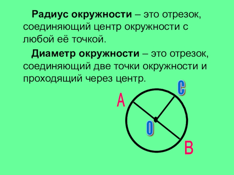 Радиус окружности – это отрезок, соединяющий центр окружности с любой её точкой.